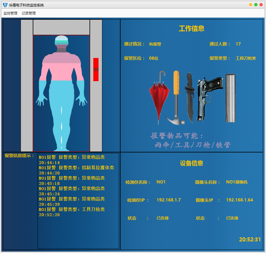 無論被檢人員身上有沒有攜帶手機、手表、鑰匙、皮帶扣等物品干擾的情況下,都能檢測到被檢人員身上的黑色金屬危險品(鐵制砍刀、鐵制槍支、鐵管、馬口鐵罐等)和有色金屬危險品(鋁制易拉罐體、銅制鋁制管體及各種金屬管體和各種金屬罐體),以及被檢人員身上攜帶的為了增大殺傷力里面放了鋼釘和鋼砂的非金屬外殼的炸彈。檢測速度0.5秒以內(nèi),通行效率40人/min以上。