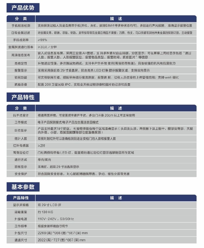 ZA-AM1629手機(jī)檢測門,可對手機(jī)進(jìn)行分類檢測和聲光報(bào)警,并排除鑰匙、皮帶扣、眼鏡、首飾、各類文具等日常金屬用品不誤報(bào);前后均采用29寸信息發(fā)布顯示屏,可實(shí)現(xiàn)圖片、音頻、視頻、字幕、實(shí)時畫面等不同素材的靈活播故;支持過程錄像和抓拍,實(shí)現(xiàn)歷史記錄反查;并針對性加強(qiáng)抗鳳和震動等干擾的能力。
